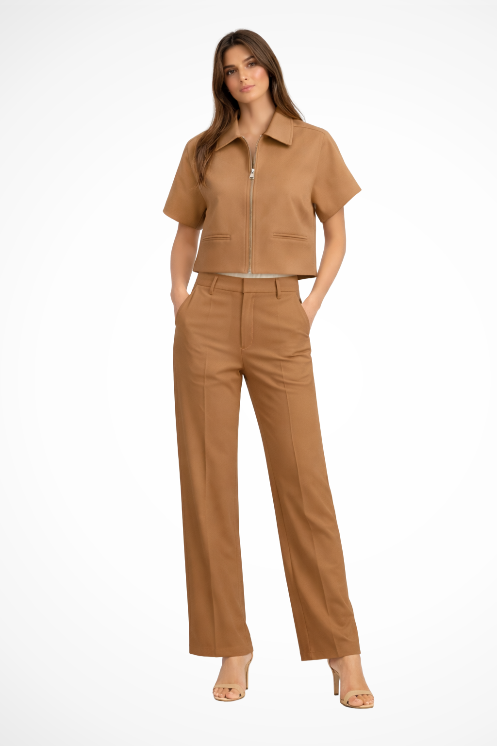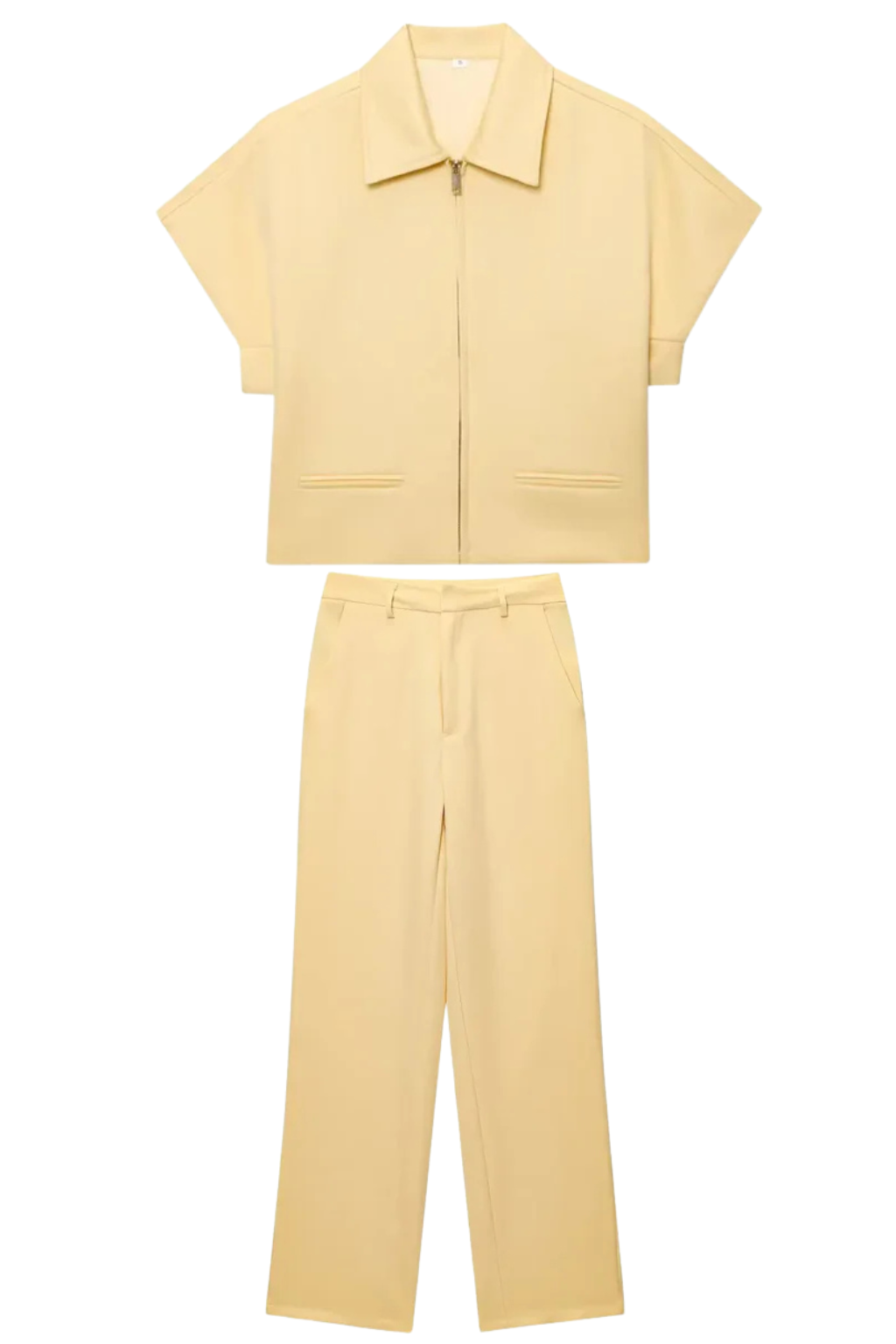 Polished, modern, and effortlessly put-together, the Elvona two-piece set delivers elevated style with everyday ease. Featuring a structured zip-front top and flowing wide-leg trousers, this coordinated set creates a sleek silhouette that works from day to night.