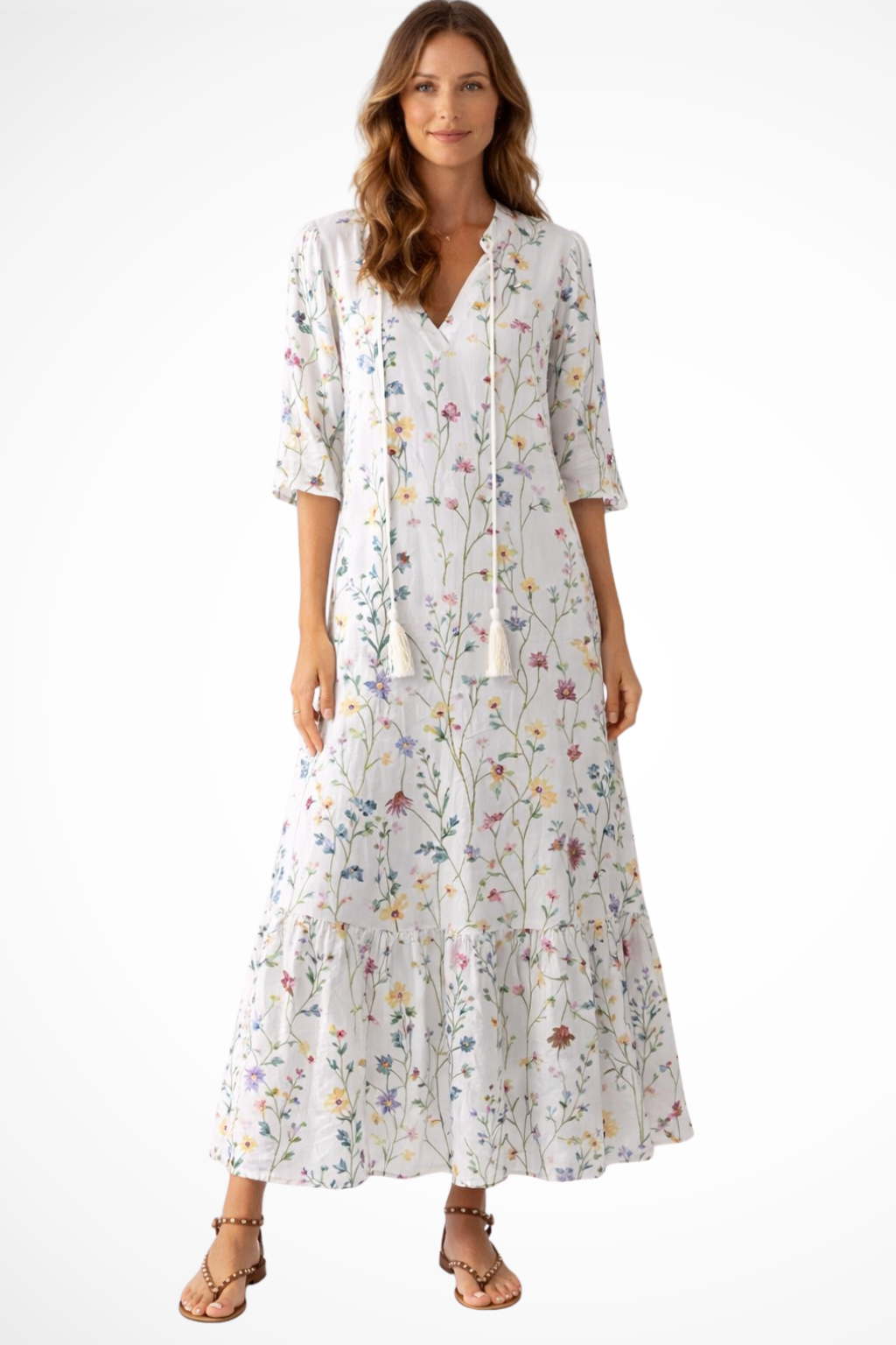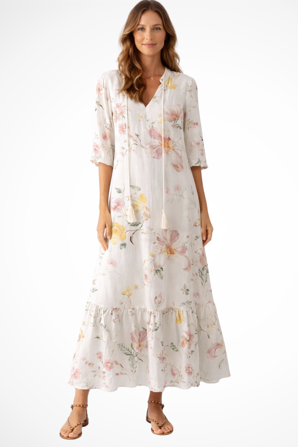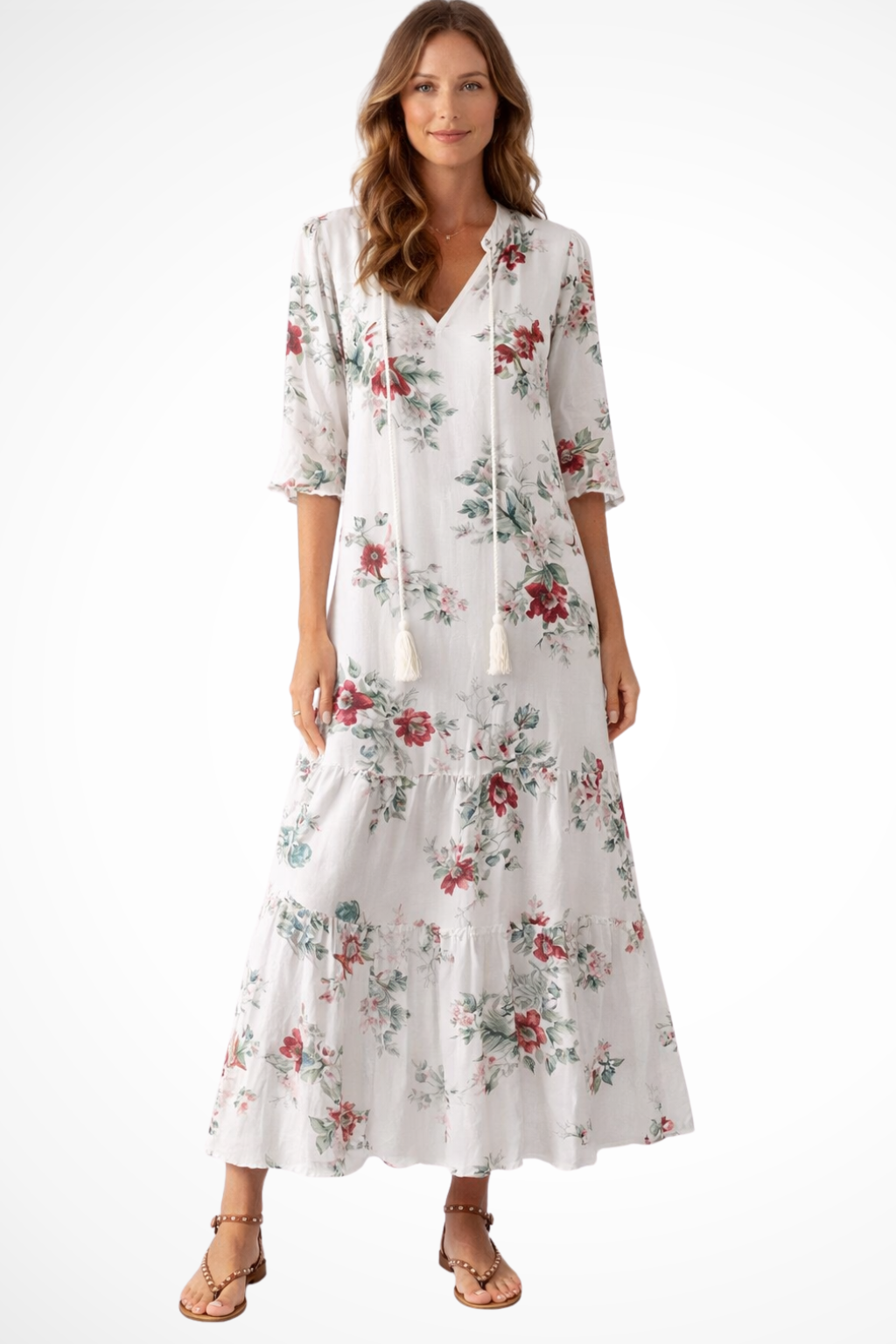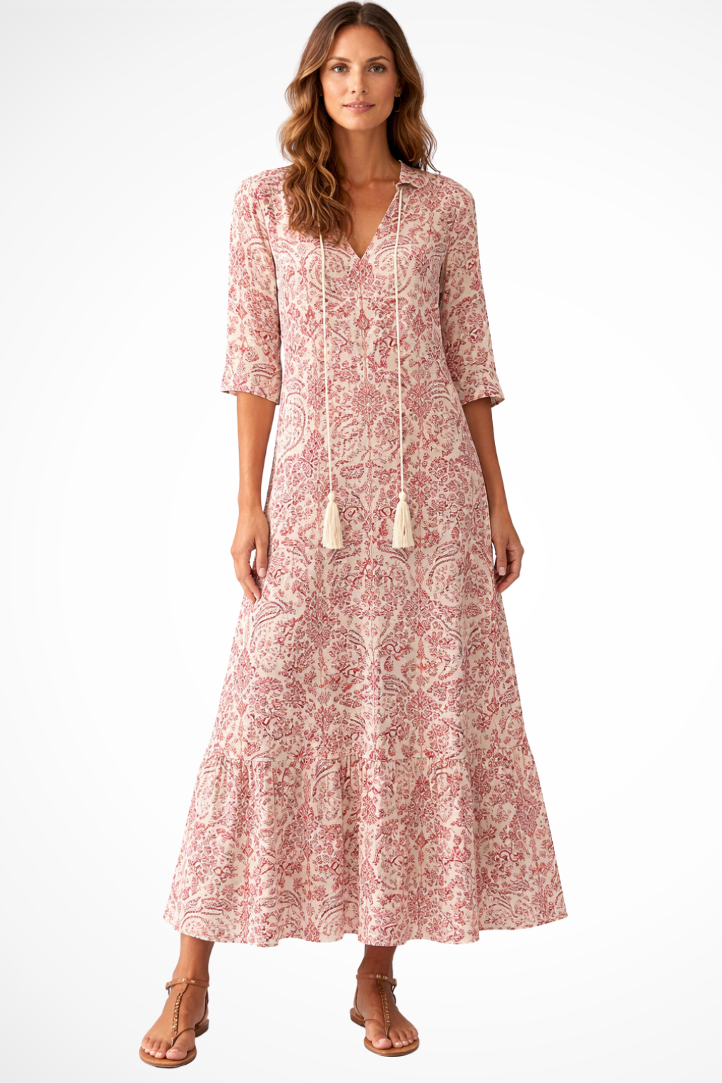 A printed maxi dress designed with a flowing cut and detailed neckline suited to warm-weather and holiday-focused outfit styling.
