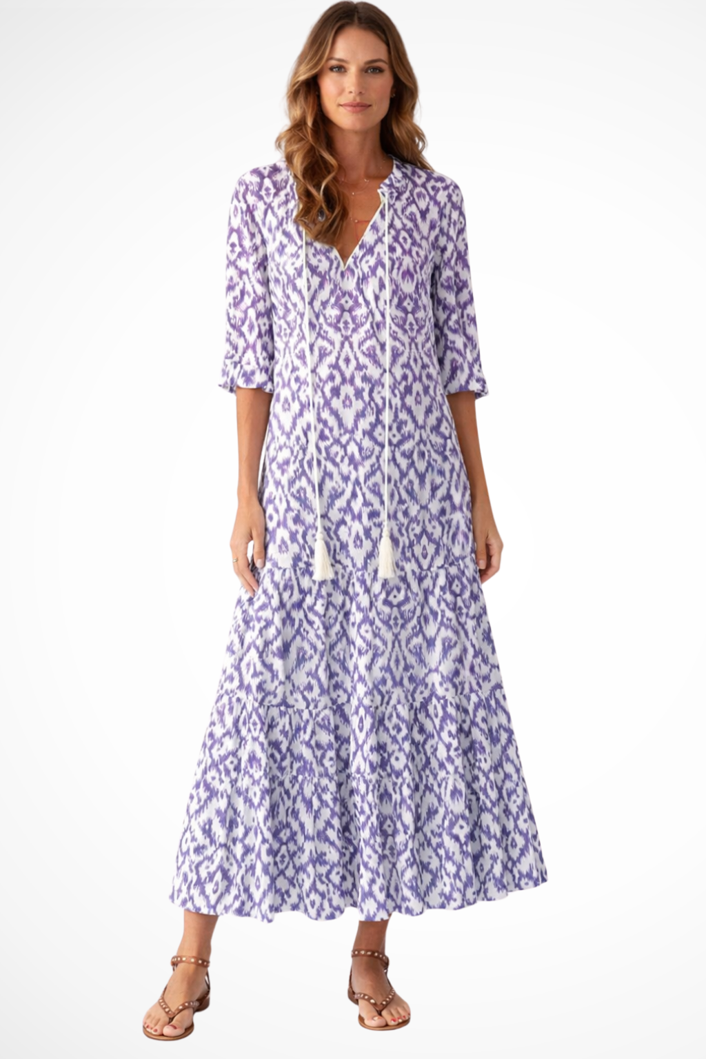 This women’s maxi dress features a loose, full-length silhouette with an all-over blue and white geometric-style print. The neckline forms a soft V shape with a short buttoned placket at the centre front, finished with tassel tie details. Three-quarter length sleeves provide partial arm coverage, while the skirt falls in a wide, gently flared line to ankle length. The repeating pattern remains consistent across the bodice and skirt for a continuous visual effect.