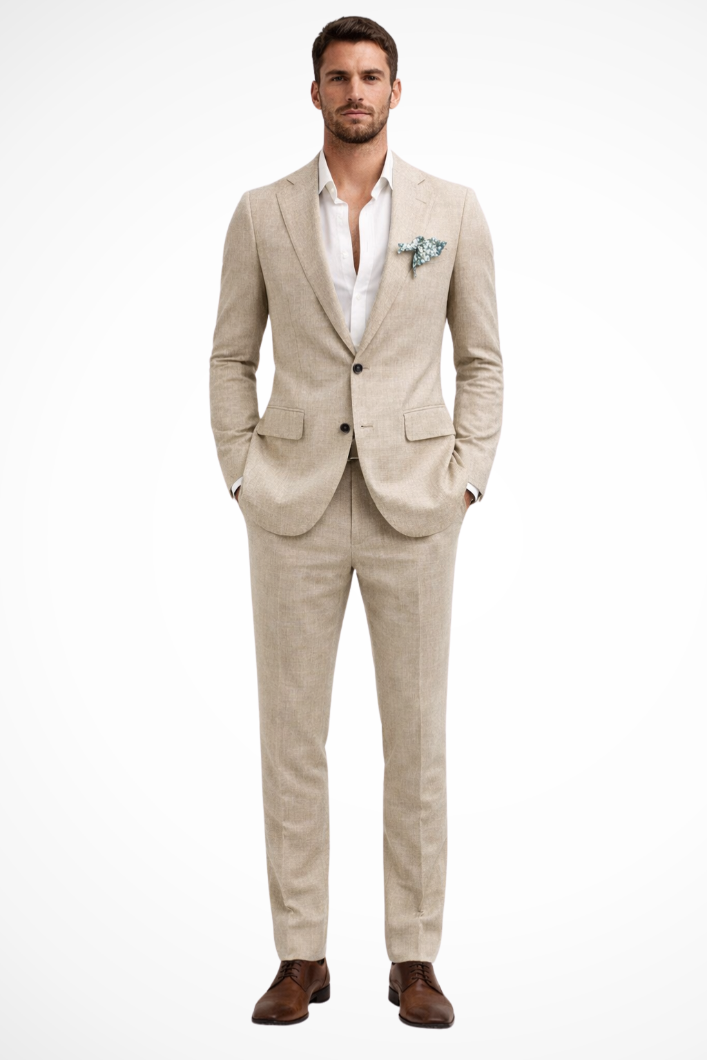 This men’s two-piece suit set consists of a matching blazer and trousers in a light beige tone with a visible natural texture across the surface. The blazer features a single-breasted front with a two-button closure and classic notched lapels forming a clean V-shaped neckline. Front flap pockets and a welt chest pocket add balanced detailing. The trousers follow a straight-leg cut, creating a coordinated silhouette when worn together for warm-weather formal and semi-formal occasions.