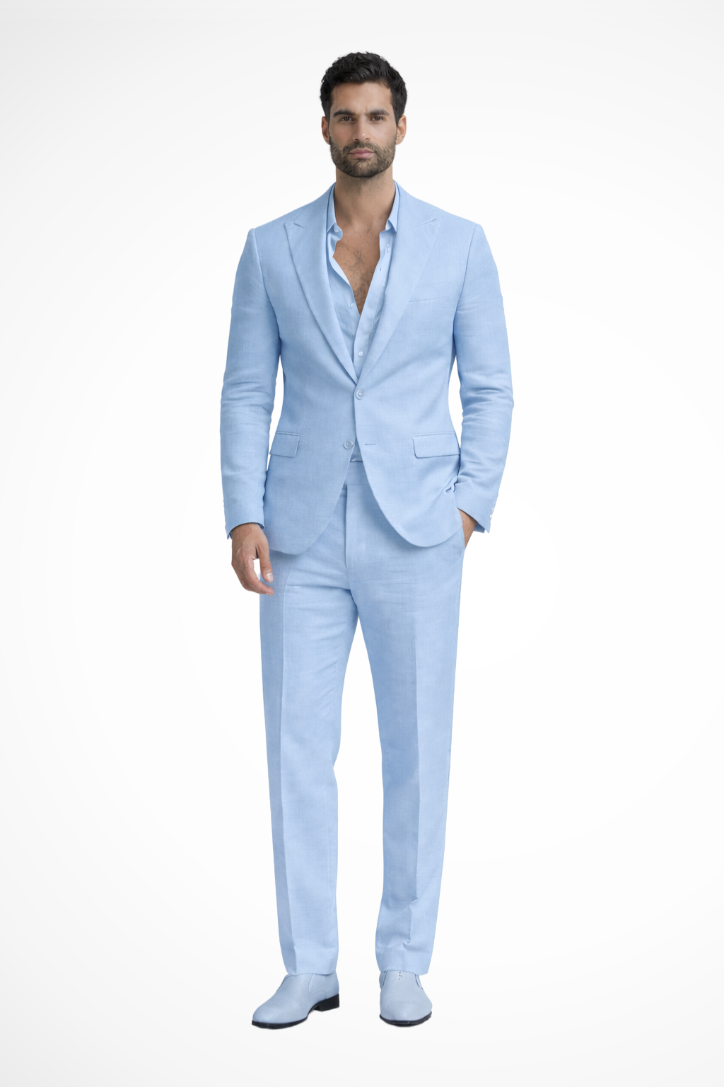 A straightforward summer suit designed for formal events and warm-weather dressing contexts.