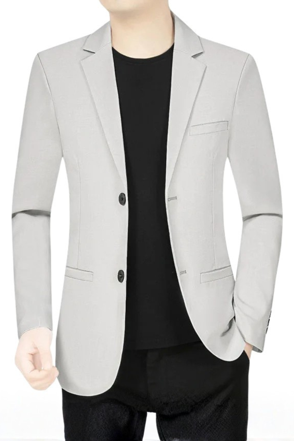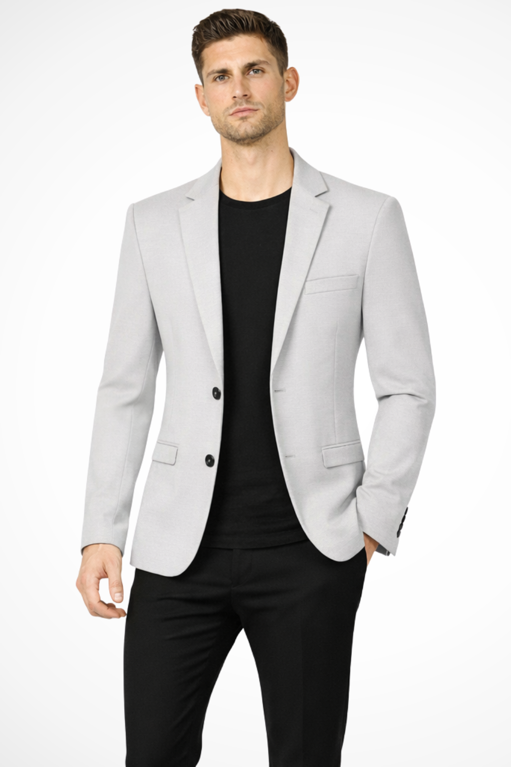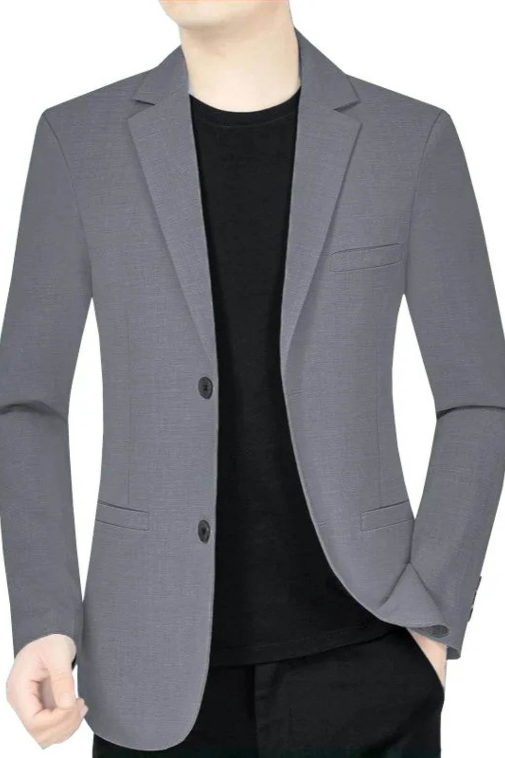 This men’s blazer is designed in a medium grey tone with a streamlined silhouette suited to formal and semi-formal occasions. The front features a single-button closure with narrow notch lapels forming a clean V-shaped opening. A welt chest pocket and two horizontal front pockets are positioned symmetrically. The long sleeves extend to the wrist, and the blazer follows a close-fitting line through the torso. The overall construction maintains a neat, structured appearance when styled with coordinating trousers.