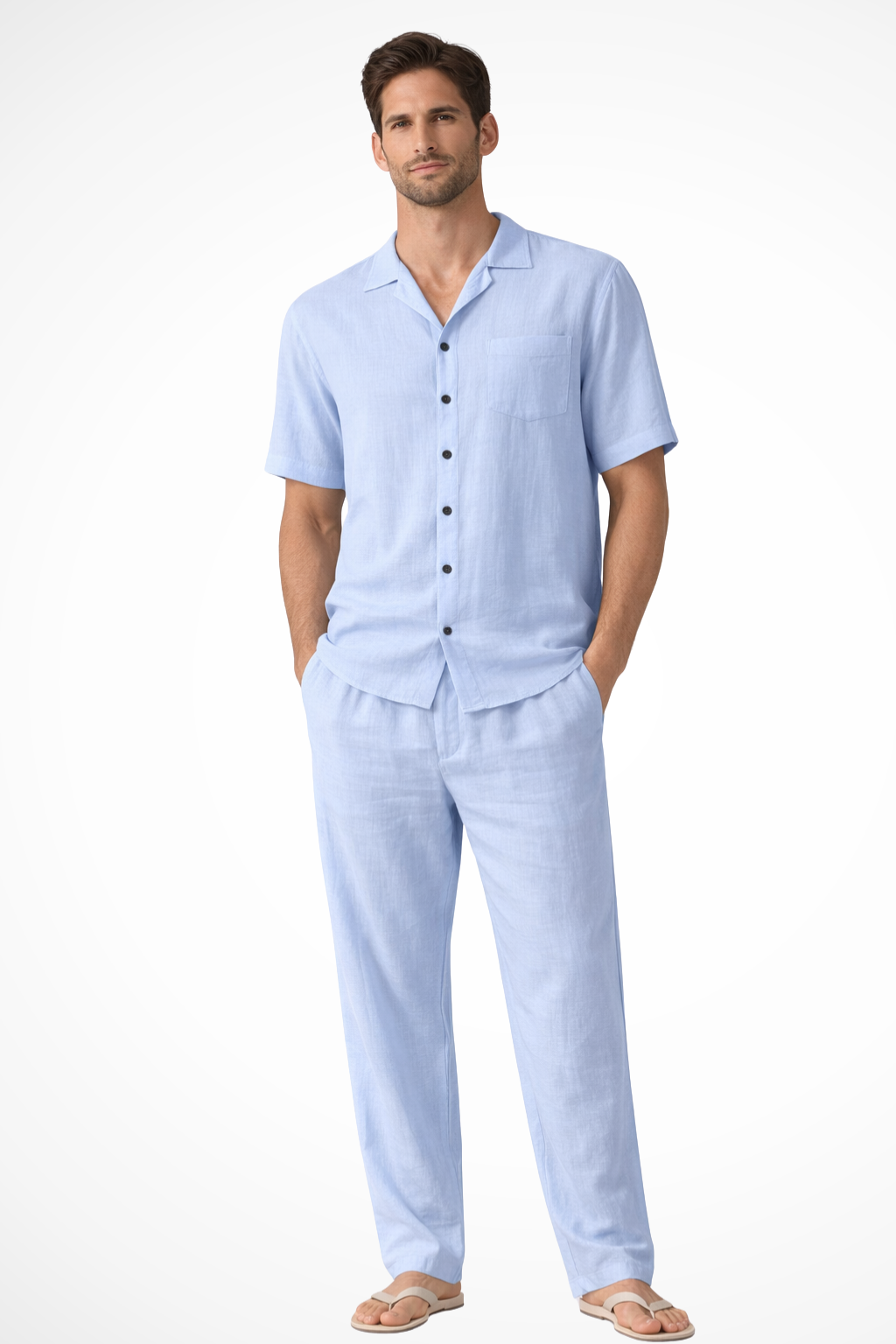 This men’s two-piece summer set includes a short sleeve button-up shirt and matching trousers in a light blue tone. The shirt features a relaxed open collar with a full button-front closure and a straight hemline. The short sleeves are cut with a loose, easy shape. The coordinating trousers have a straight-leg silhouette and are designed for a relaxed fit. Both pieces share a consistent colour and lightly textured surface, creating a coordinated look suitable for warm-weather settings.