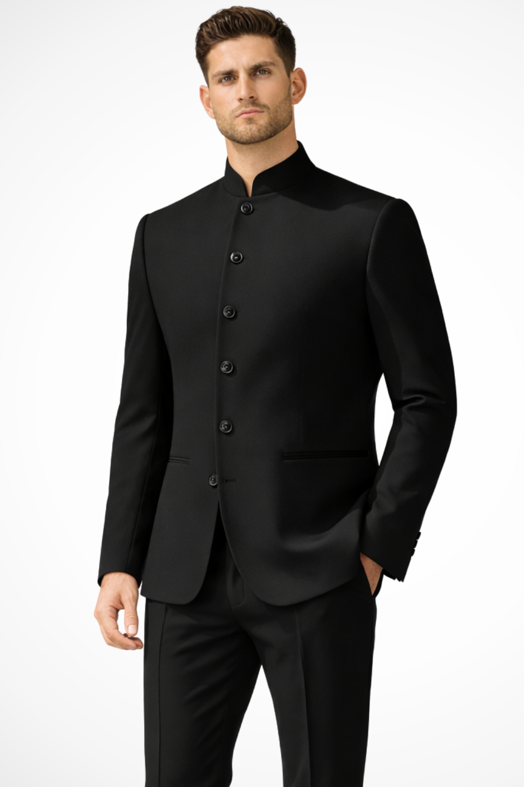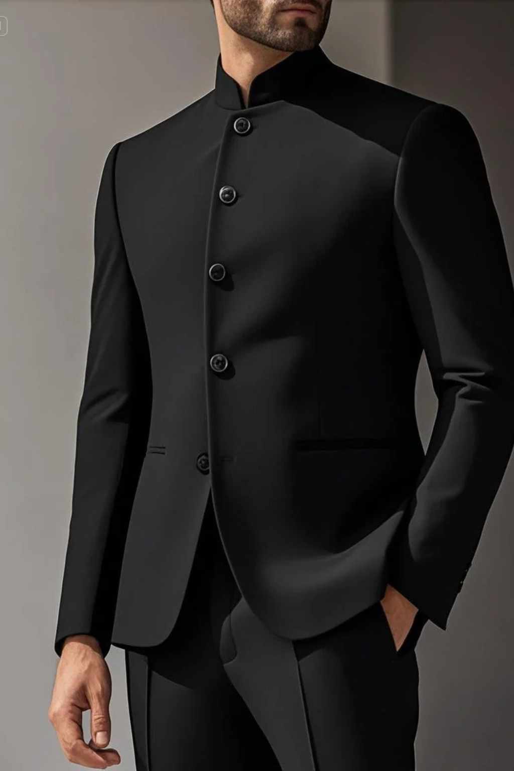 This men’s blazer is designed in a solid black tone with a streamlined silhouette and a stand collar neckline. The front features a straight button closure with evenly spaced buttons running down the centre. The collar sits upright without lapels, creating a clean vertical line from neckline to hem. Long sleeves extend to the wrist, and the blazer follows a close-fitting shape through the torso. Subtle front pocket placements are integrated into the design without disrupting the overall line.