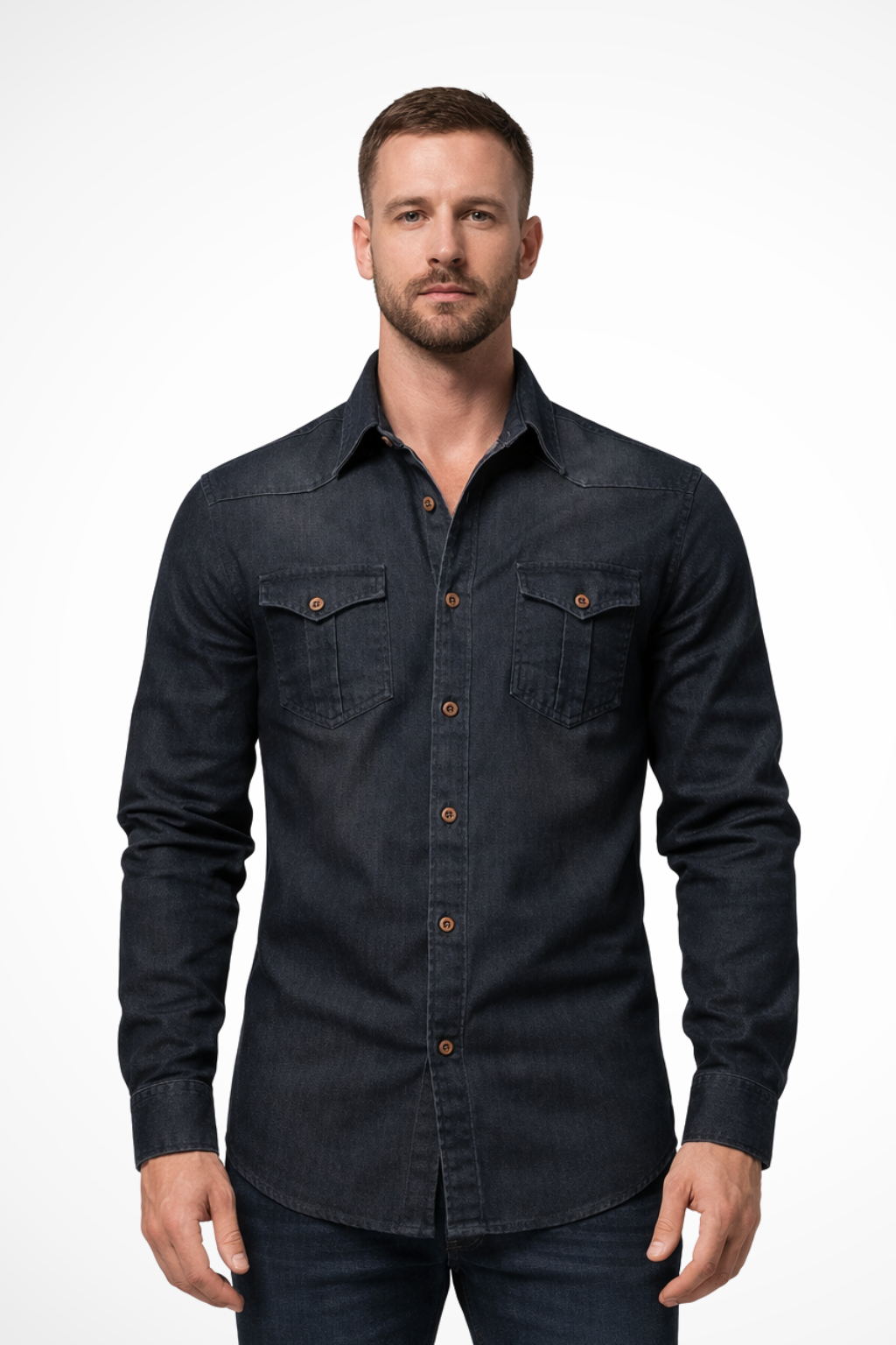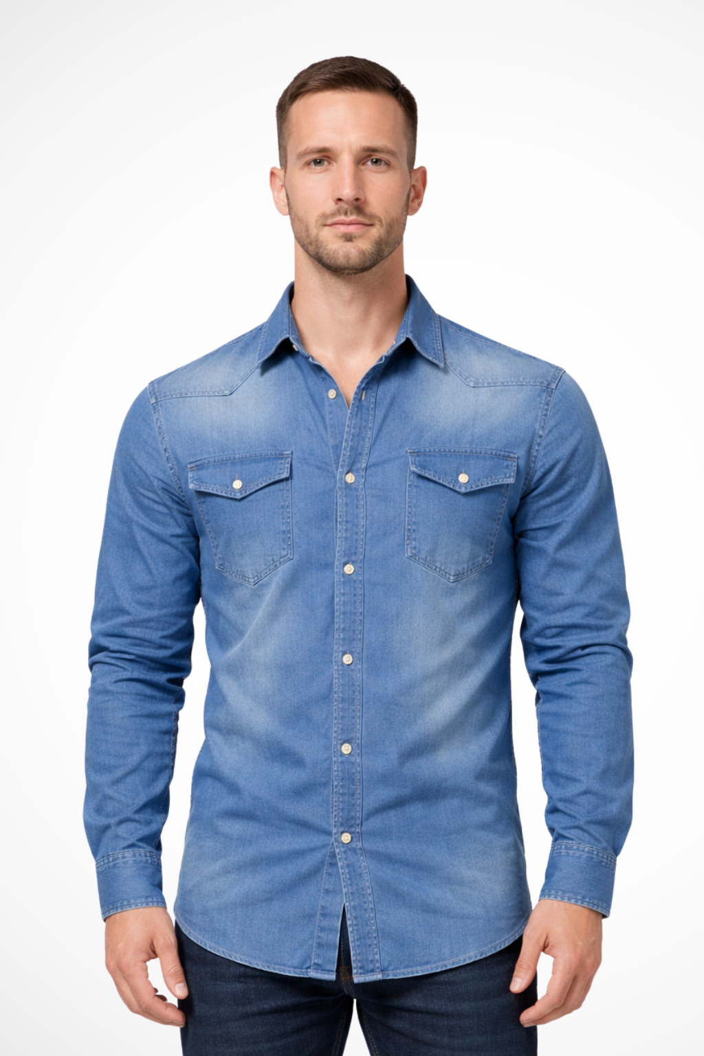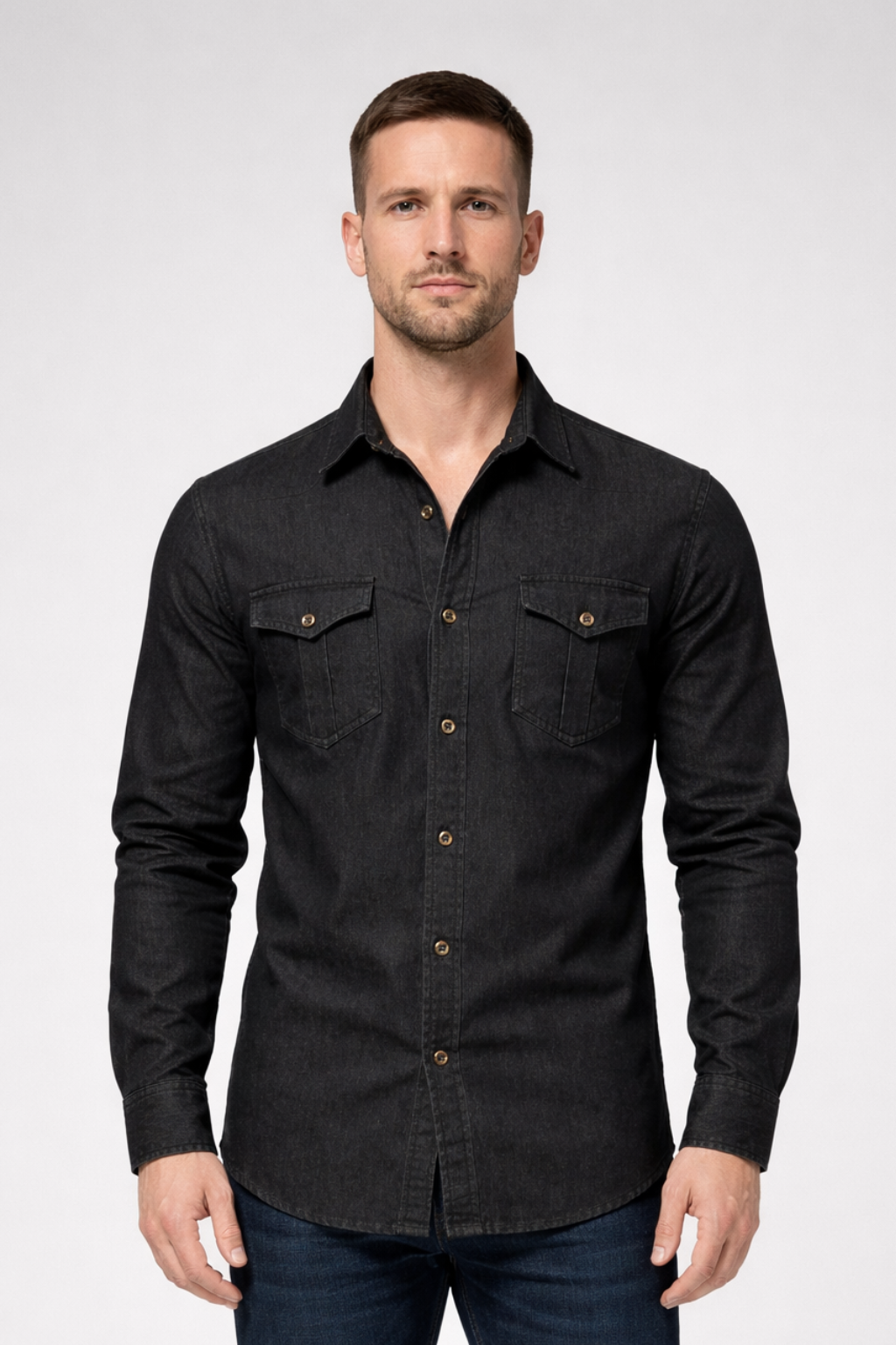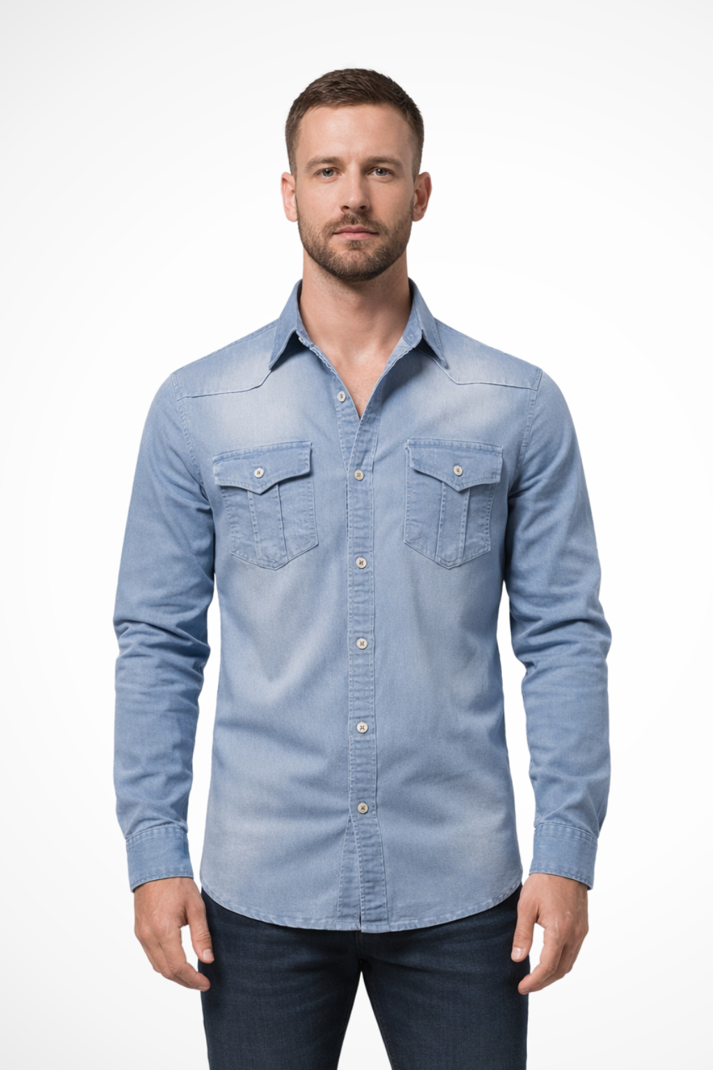 This men’s long sleeve button-down denim shirt is designed with a slim fit profile and a clean, structured outline. The front features a full button placket with visible buttons, complemented by two chest flap pockets that add balanced visual detail. Long sleeves with buttoned cuffs support a neat, tapered appearance through the arms. The denim finish gives the shirt a refined yet casual look, suitable for wearing on its own or layered with lightweight outerwear.