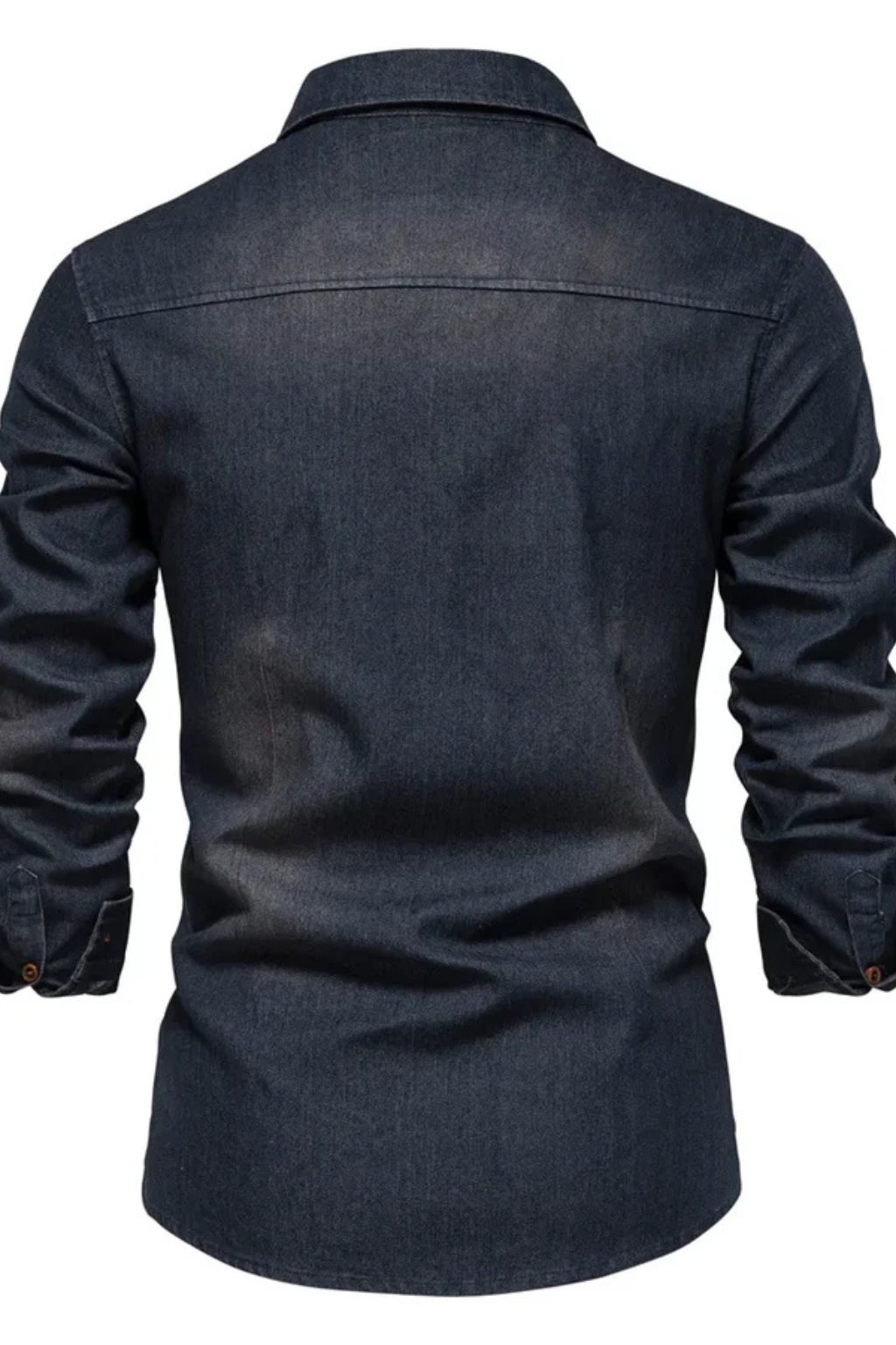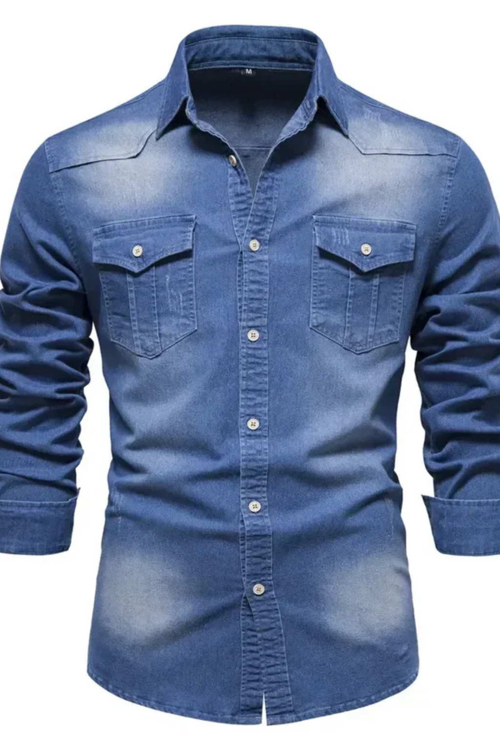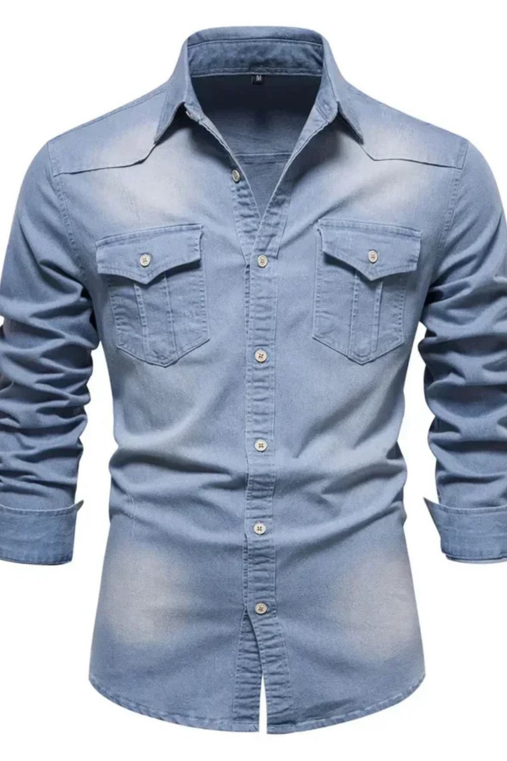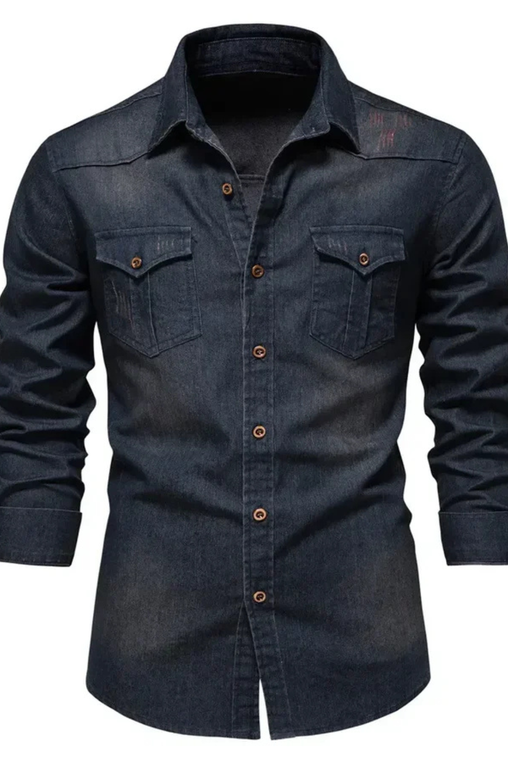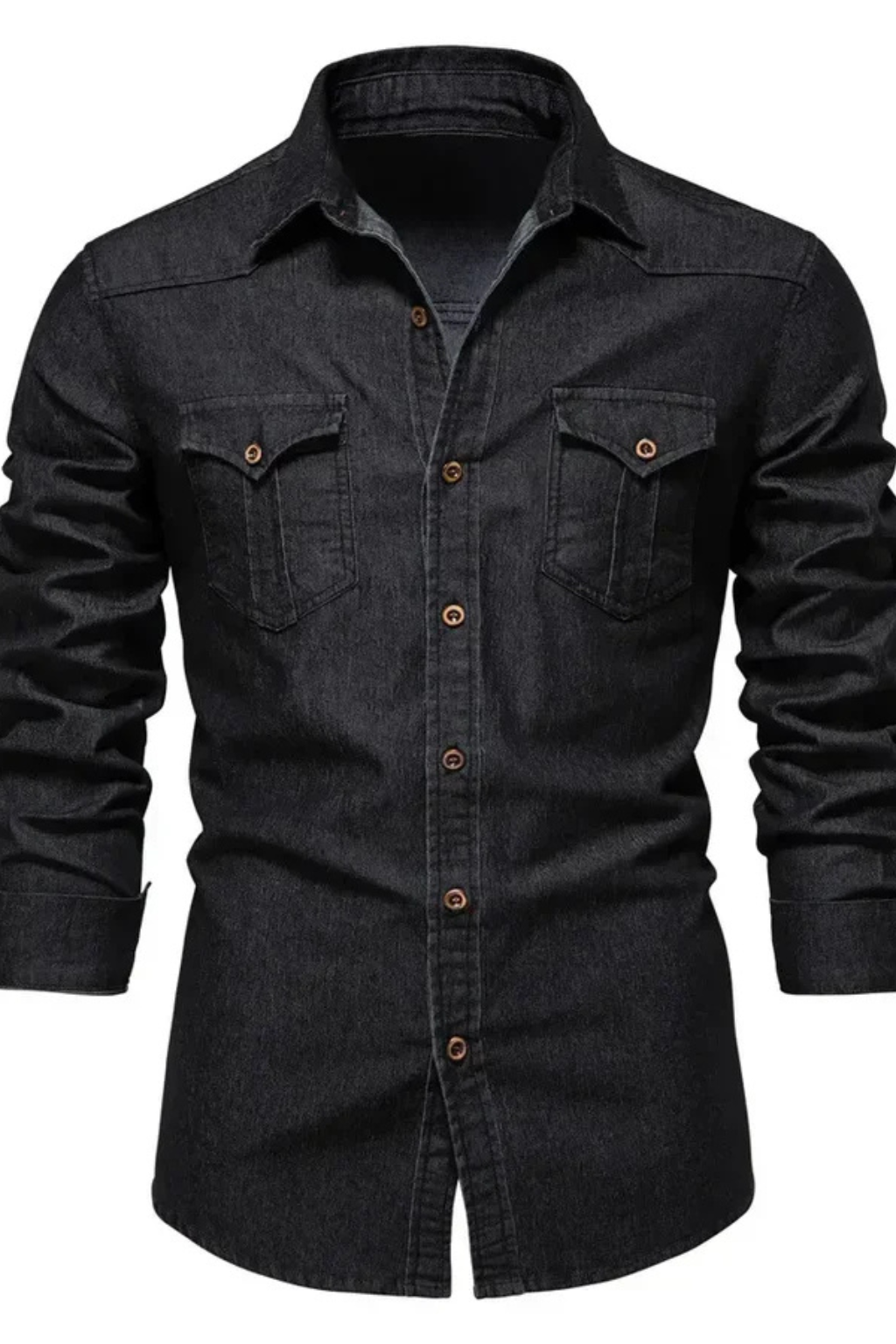 This men’s long sleeve button-down denim shirt is designed with a slim fit profile and a clean, structured outline. The front features a full button placket with visible buttons, complemented by two chest flap pockets that add balanced visual detail. Long sleeves with buttoned cuffs support a neat, tapered appearance through the arms. The denim finish gives the shirt a refined yet casual look, suitable for wearing on its own or layered with lightweight outerwear.