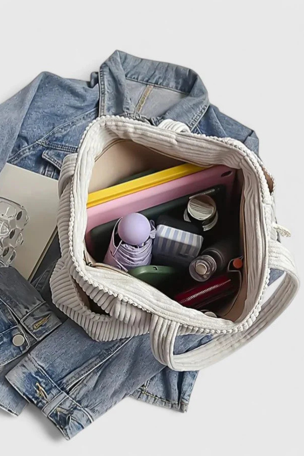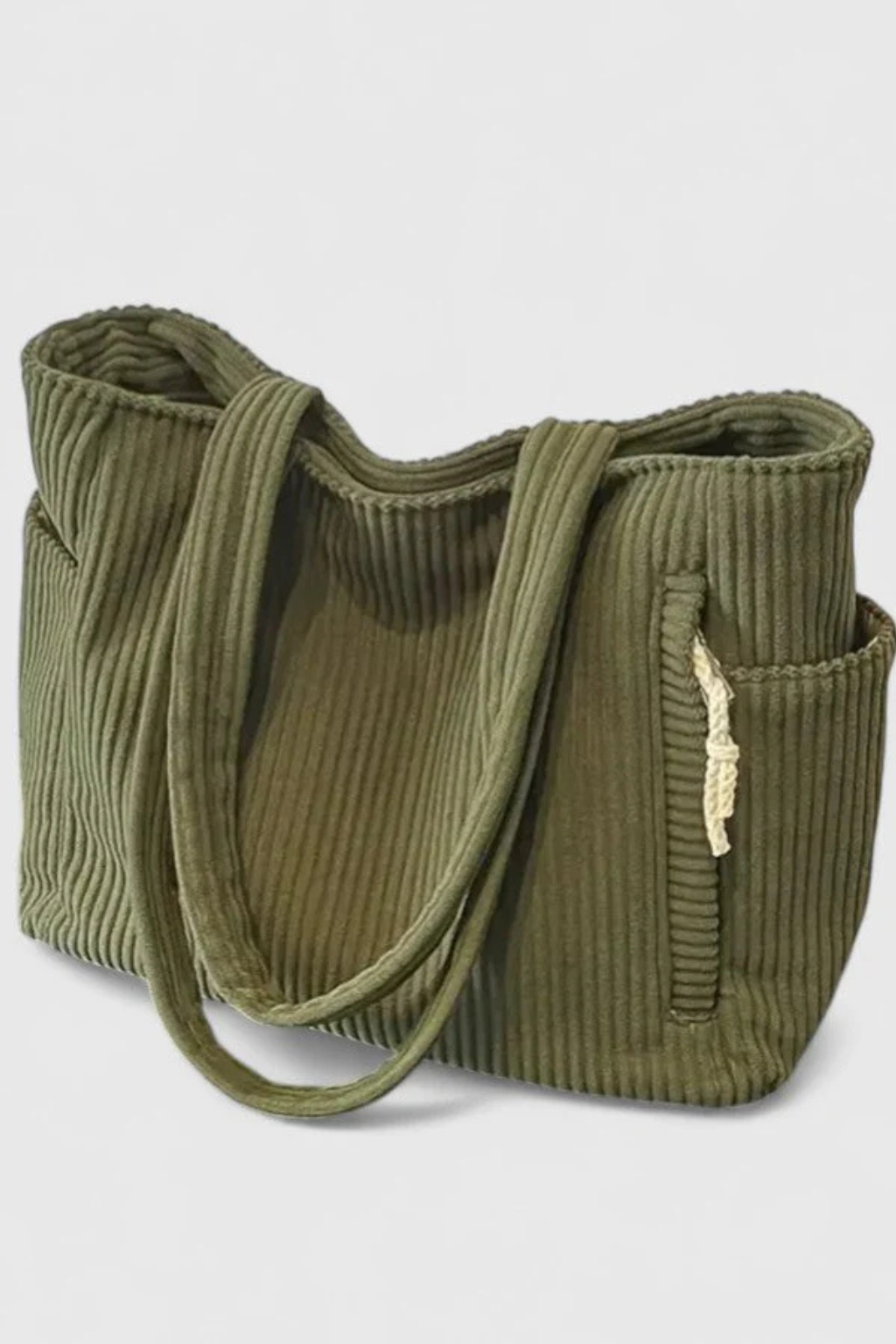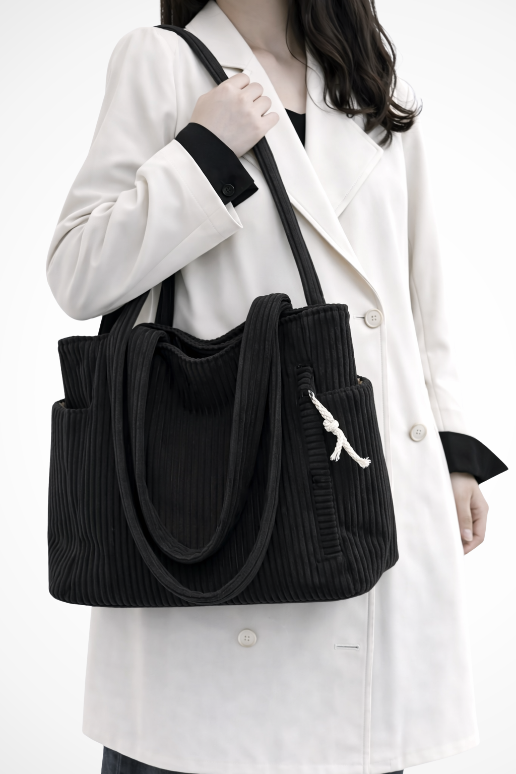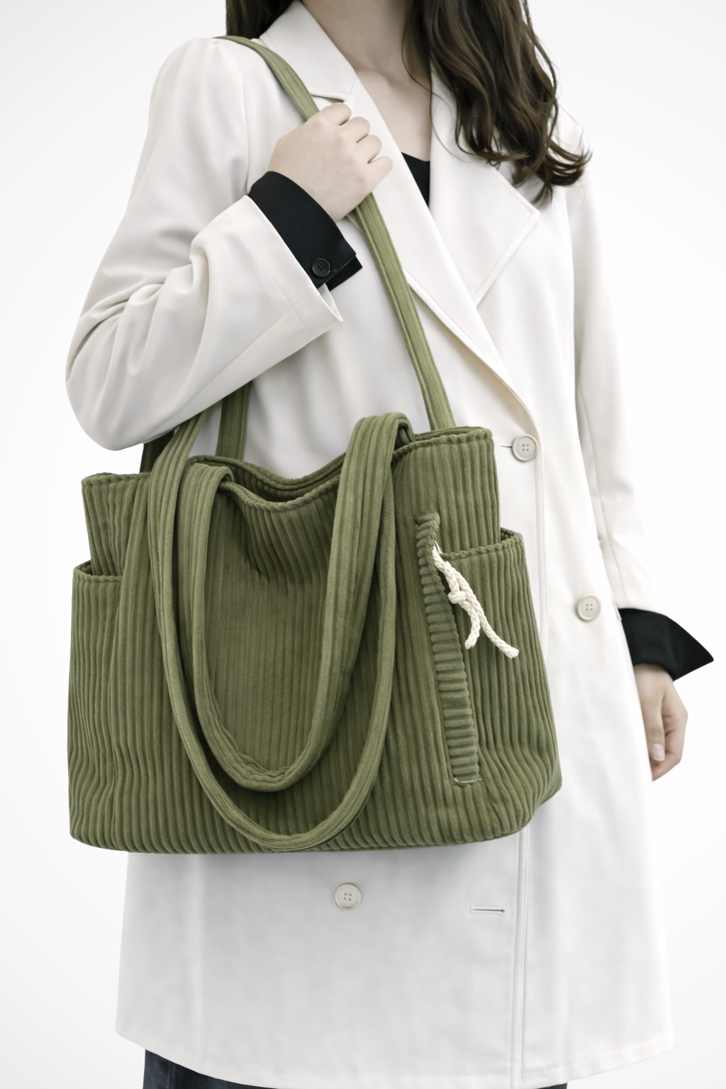A practical everyday tote designed with textured corduroy fabric and multiple storage options for daily essentials.