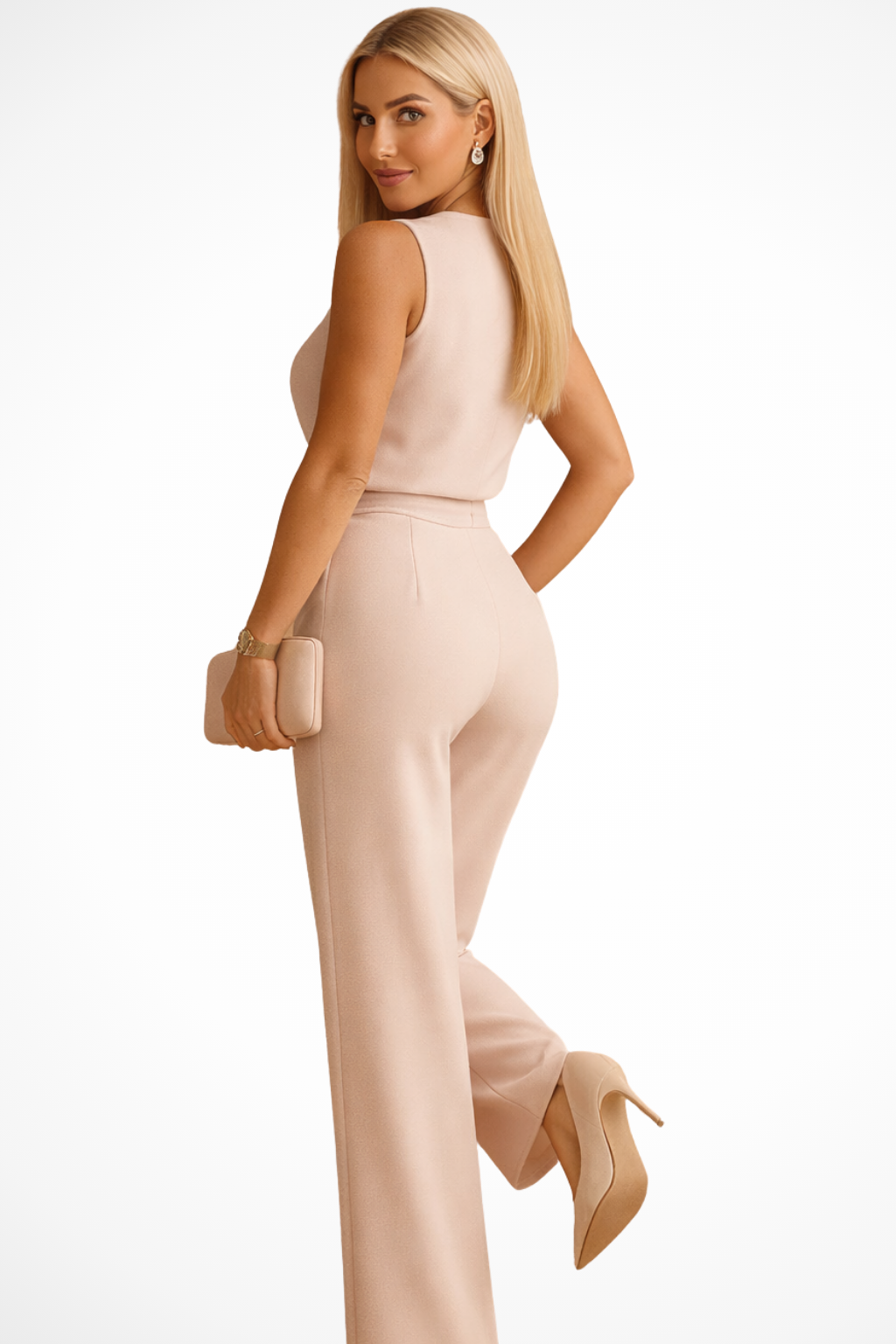 This women’s jumpsuit features a wrap-style front with a wide, folded neckline and a tie belt that creates a defined waistline. The sleeveless design supports layering with outerwear, while the straight wide-leg cut provides a balanced silhouette from top to hem. The smooth, uniform surface keeps the look streamlined, making the piece suitable for pairing with simple accessories for a coordinated formal or semi-formal outfit.