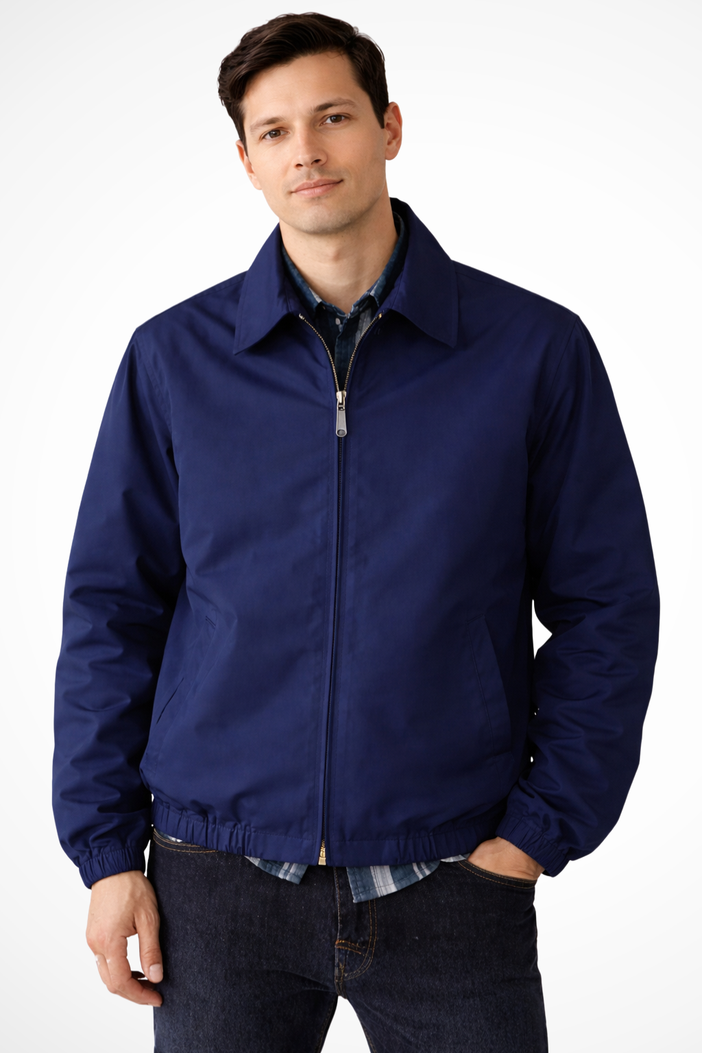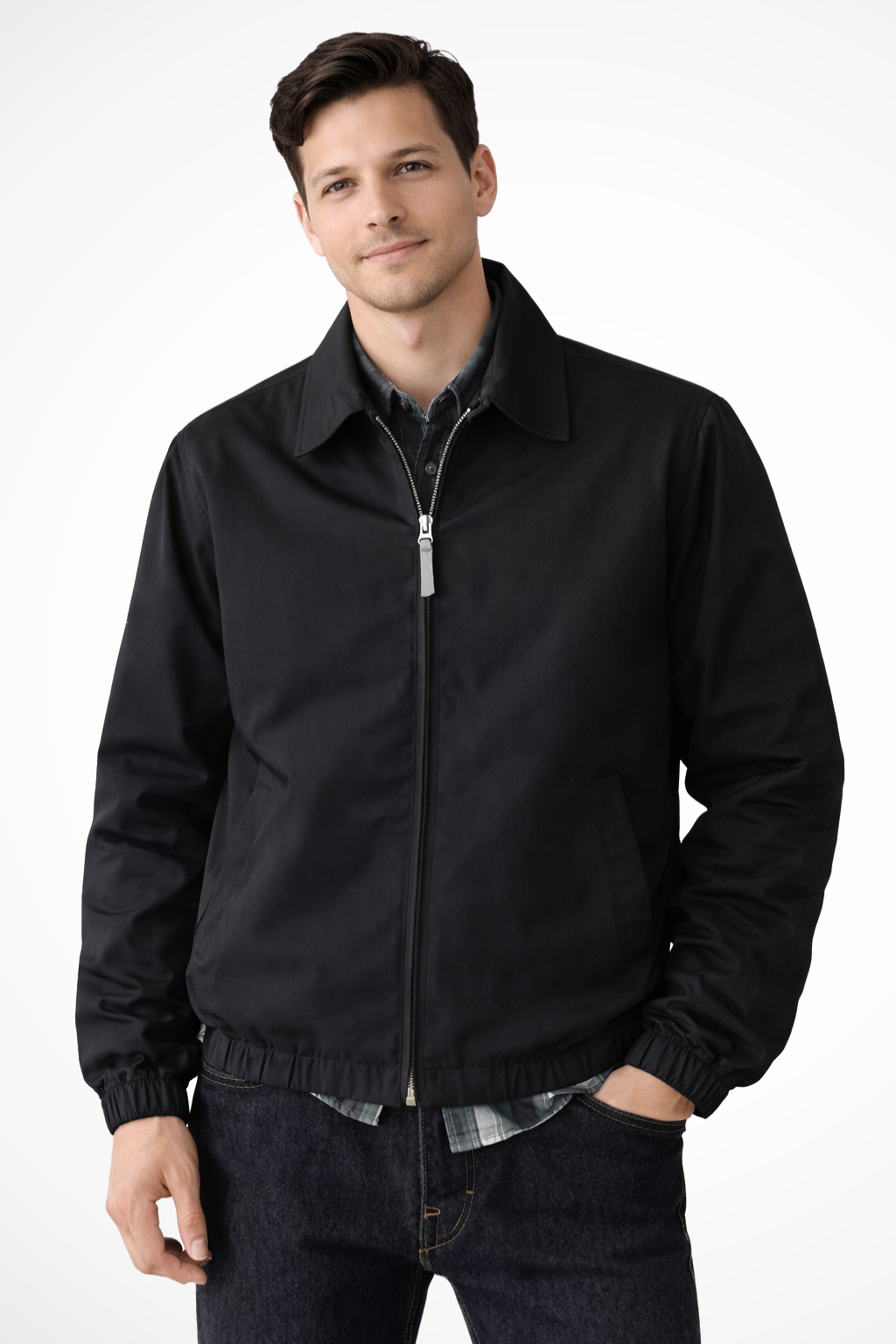 Men’s Harrington-style jacket featuring a zip-up front, fold-down collar, elasticated cuffs and hem, and a clean minimal design, suitable for everyday layering.