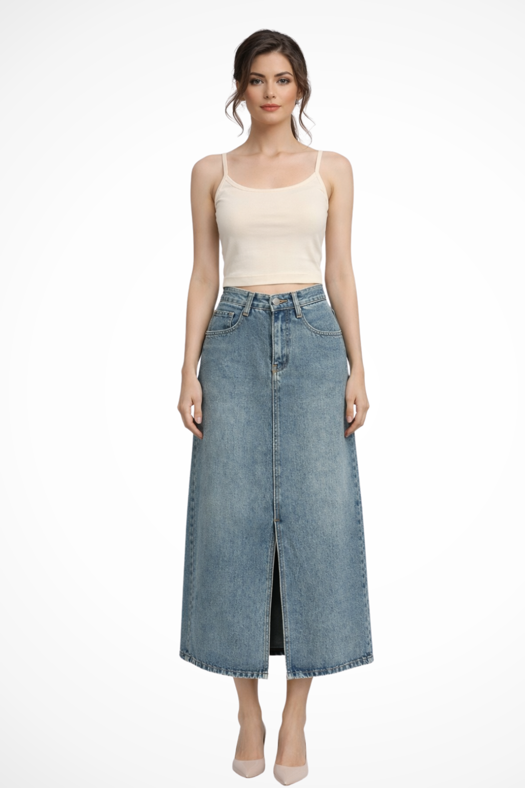 This women’s denim skirt is designed with a high-rise waist and a straight silhouette that extends to a maxi length. The front features a central slit that allows ease of movement while maintaining the structured shape of the skirt. Classic denim detailing is visible through the waistband, belt loops, and pocket construction. The overall design follows a clean, elongated line, making it suitable for pairing with fitted tops, shirts, or lightweight layers.