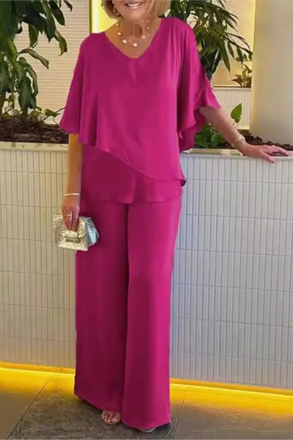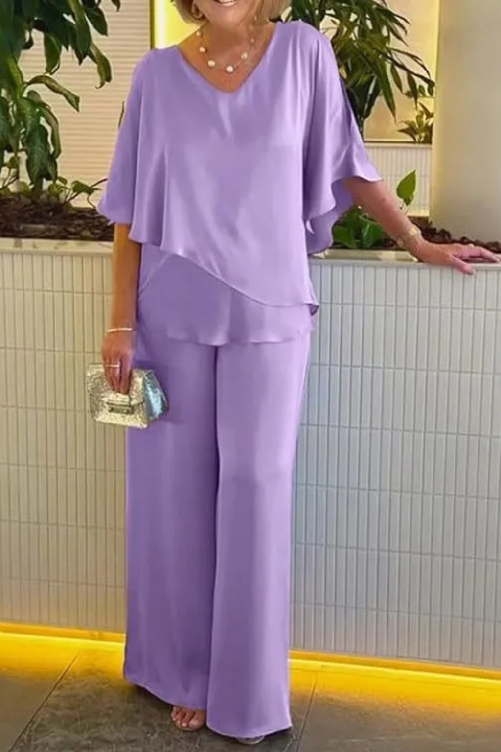 A coordinated set defined by clean lines and a fluid silhouette suitable for occasion or daytime wear.