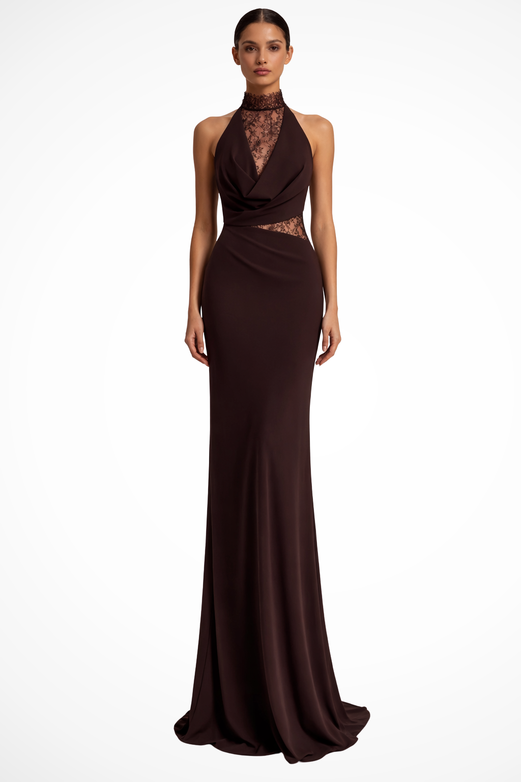 This sleeveless maxi dress is designed with a halter neckline and a fitted bodice featuring sheer lace panels at the front and waist. The neckline extends into a lace high collar detail, while the skirt falls straight to a floor-length hem. The structured upper section contrasts with the fluid drape of the skirt, creating a defined silhouette. Suitable for wedding guest settings and formal occasions, it pairs with heels and a compact clutch.