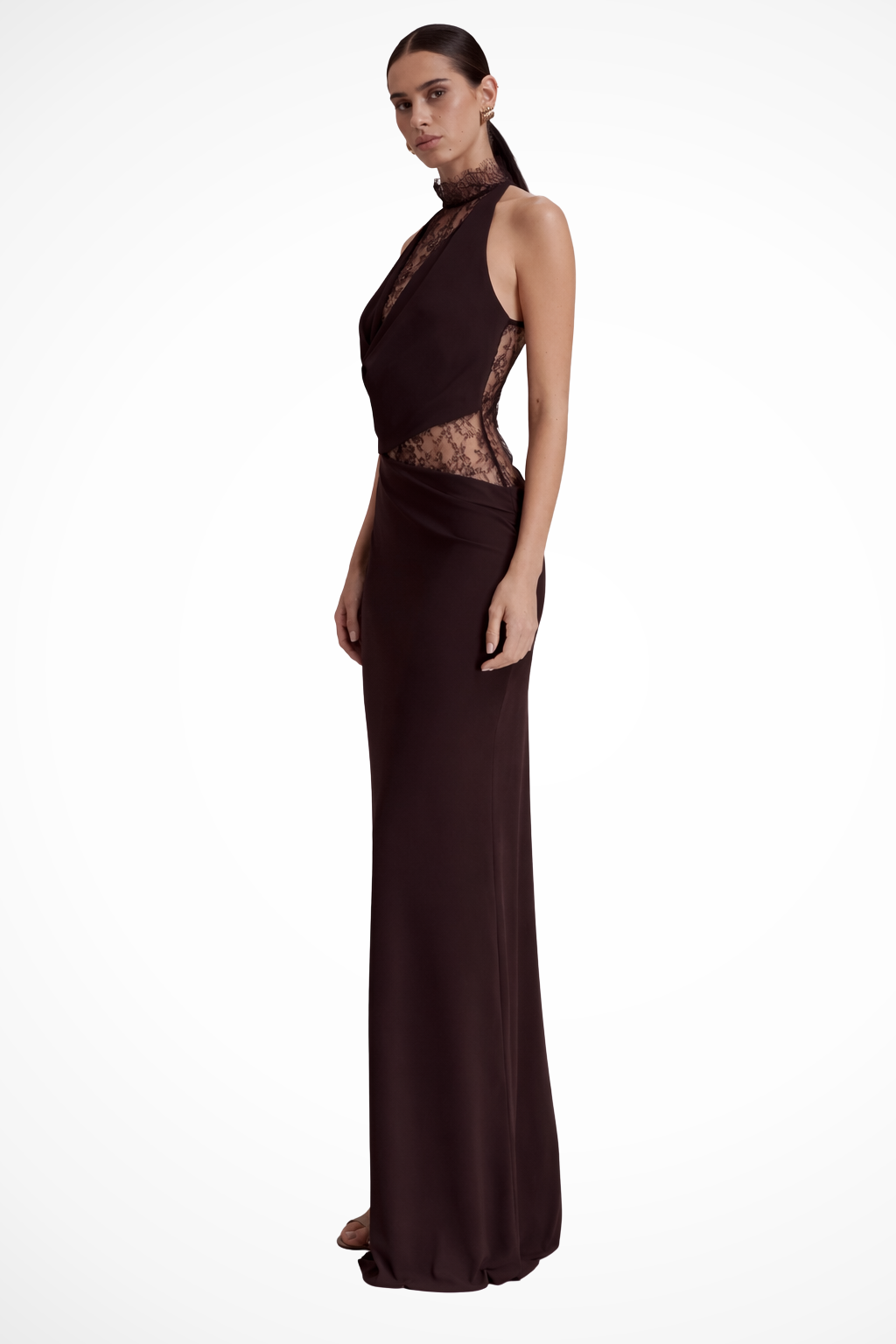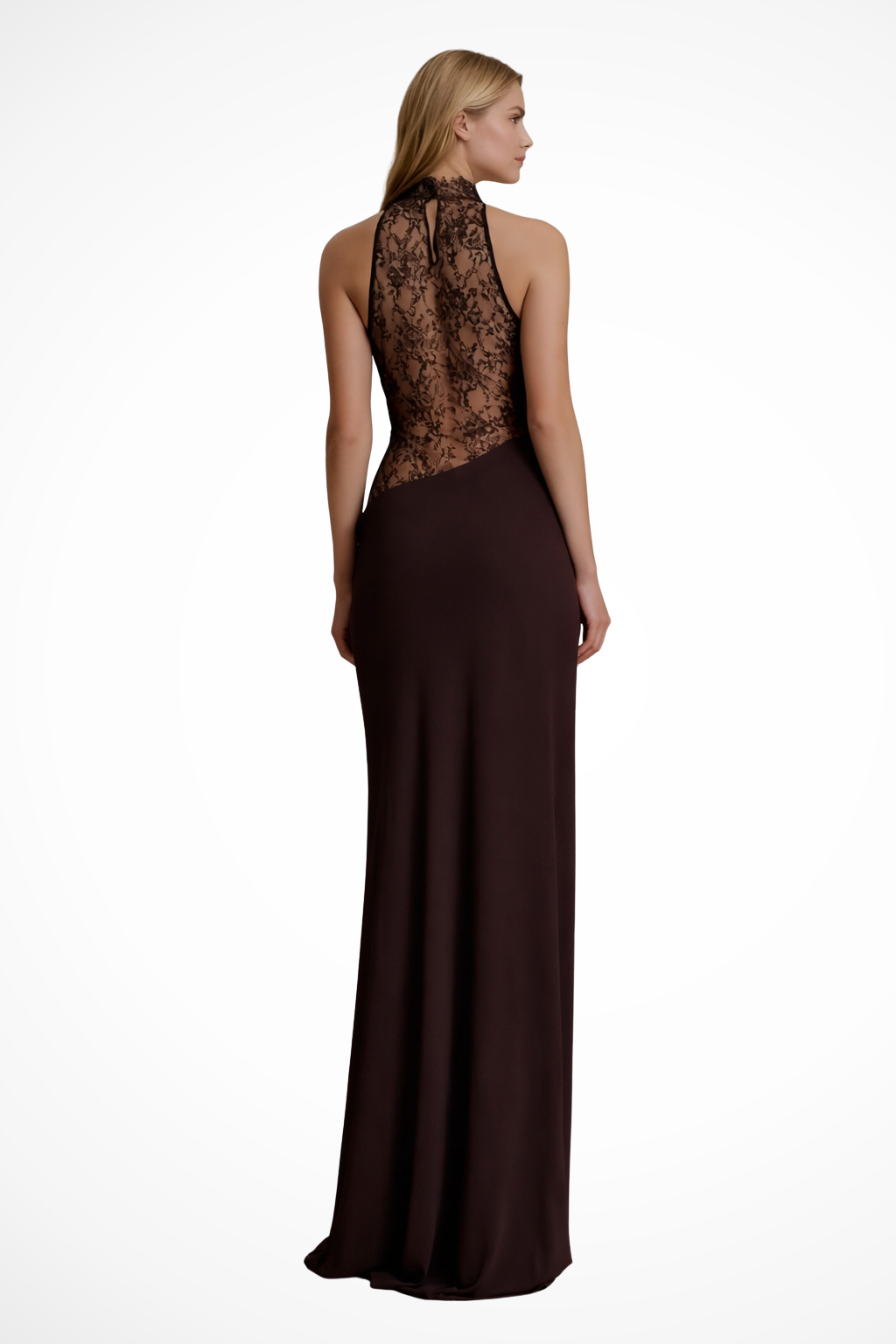 A floor-length occasion dress combining structured lace elements with a clean, extended skirt line.